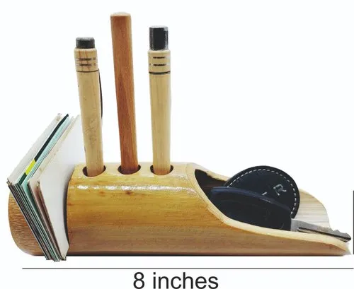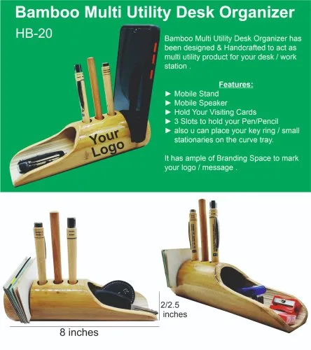 Happy bamby bamboo desk organiser has been specially designed and hand crafted to organise your desk accesories and also enhance the look of your desk / work station. Features 1)mobile stand 2)mobile speaker 3)hold your visiting cards4)slots to hold your pen/pencil5)also u can place your key ring / small stationaries on the curve tray. It has ample of branding space to mark your logo / message .