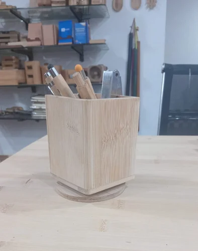 Bamboo speaker natural with pen stand on wooden base. Branding can be done (laser engraving / screen print) Moq 100pcs Color option and gloss/matt polish options available