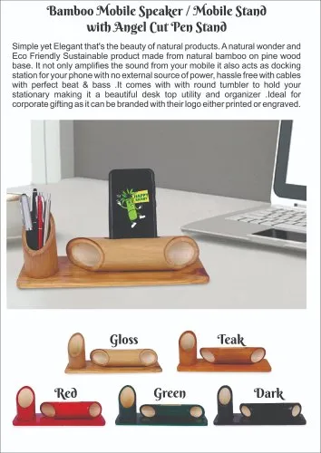 Bamboo speaker natural with pen stand on wooden base. Branding can be done (laser engraving / screen print) Moq 100pcs Color option and gloss/matt polish options available
